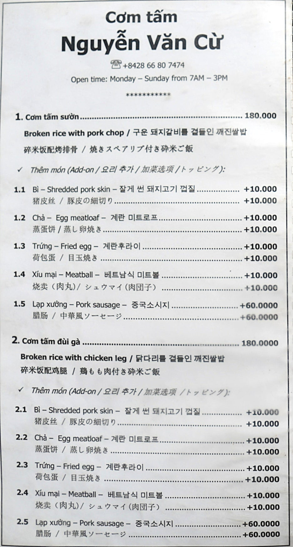 돼지갈비, 닭고기 등 껌땀의 주재료를 고르고, 거기에 무엇을 추가해 먹을 것인지 결정하면 되는 형태. 보통은 1번 돼지갈비에, 1-1번 돼지껍질, 1-3번 계란 프라이로 먹는다고 한다. 하지만 우리는 하나 더 1-4번 베트남식 미트볼도 하나 추가해 보았다.
