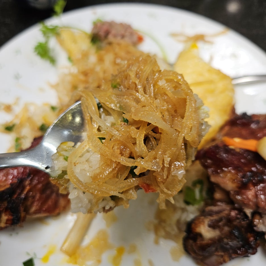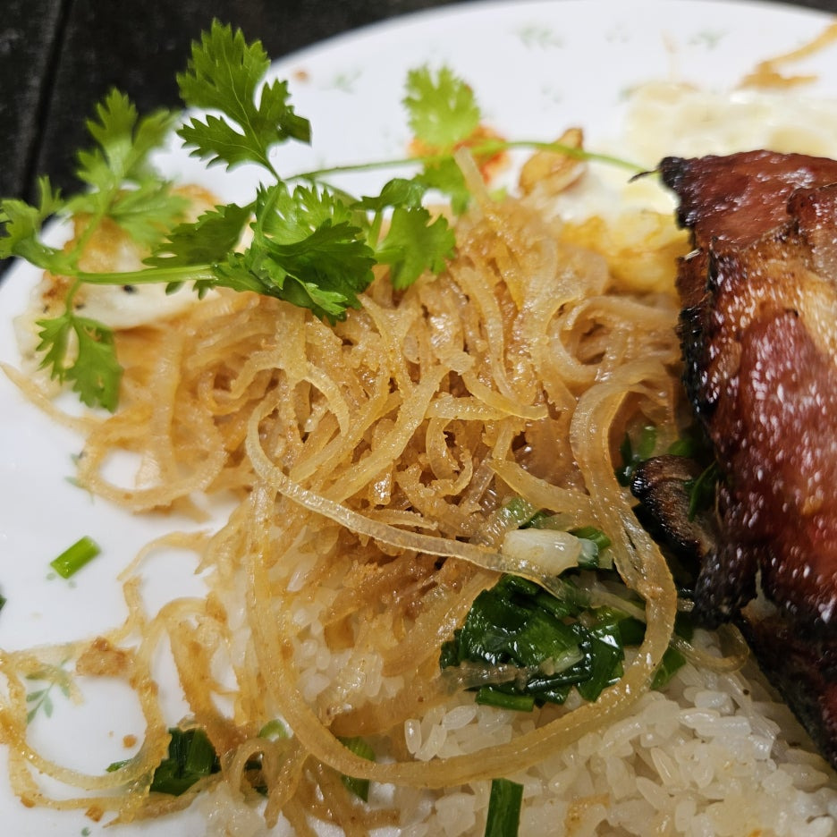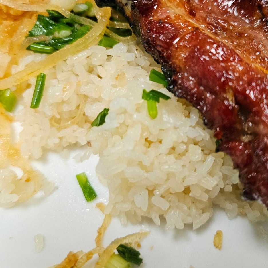 껌땀의 원래 주인공인 밥. 동남아시아에서 흔히 접하는 길쭉한 쌀이 아니다. 이것이 깨진 쌀로 지은 밥의 모습인 듯. 오히려 우리나라에서 먹는 찰진 밥과 비슷하게 생겼다.