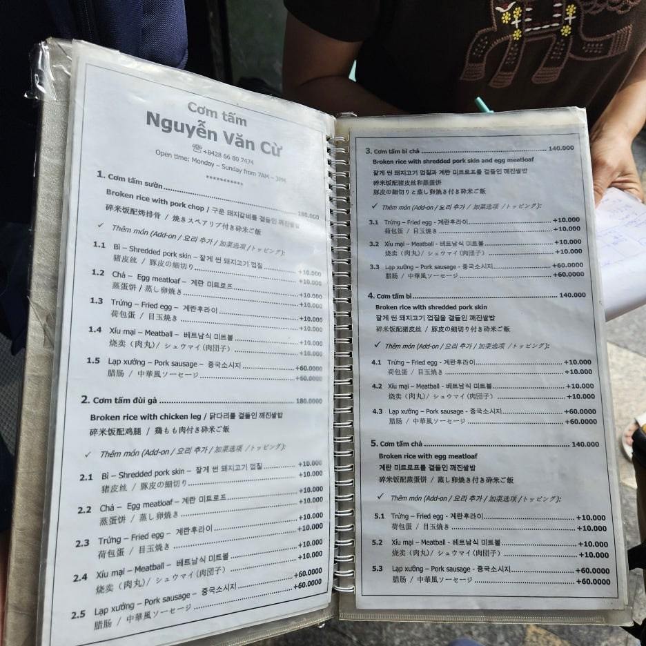 줄은 그냥 사람들 뒤에 따라 서면 되는 듯. 내부는 아주 넓은 편은 아니었고, 손님들로 꽤 차있다. 그런데, 대다수가 현지인으로 보여서 놀랬다. 여기 껌땀은 기본 가격이 180,000동, 한화로 1만 원 정도라 상당히 비싼 편인데 이렇게 현지인이 많다는 것은 그만큼 맛있는 곳이라는 뜻일 듯.