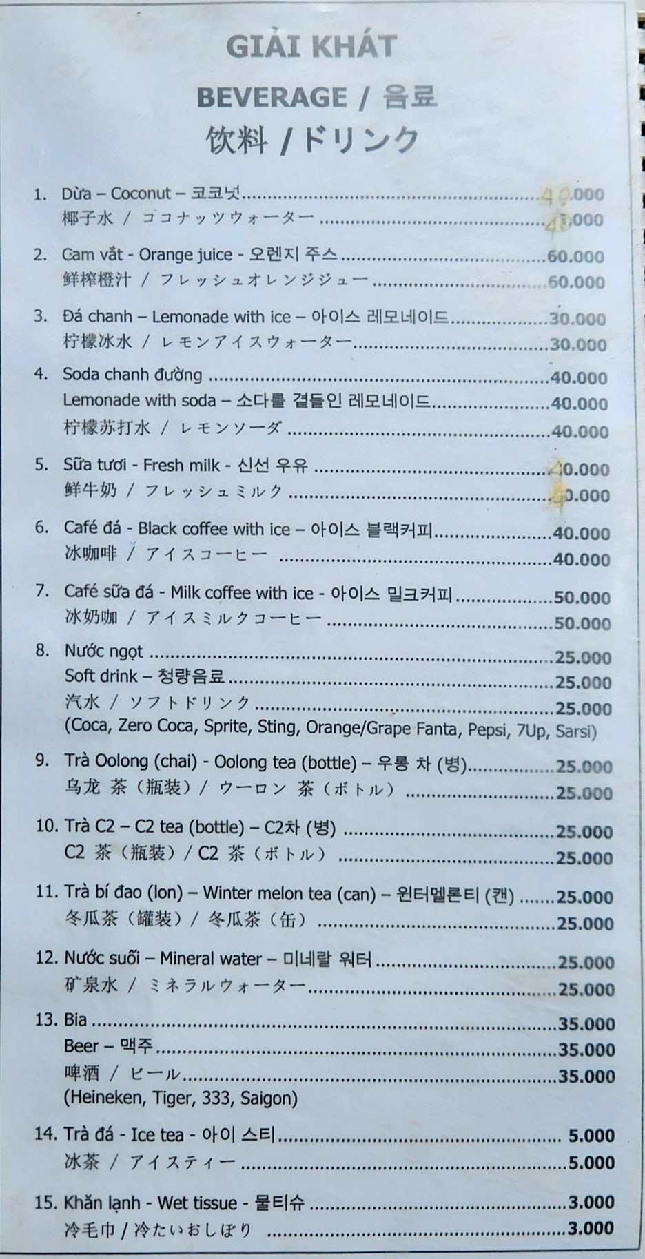 음료수까지 포함해서 총 470,000동. 약 25,000원 정도. 베트남의 물가치고는 정말 비싼 가격이다. 한국에서 점심 한 끼 먹는 가격보다도 비쌀지도 모르겠다. 그래도 관광객의 입장에서는 꼭 한번 먹어볼 만한 가치가 있는 훌륭한 한 끼였다. 길거리 껌땀이 보통 3~5만 동인데, 이 곳은 6배나 비싼 가격임에도 불구하고 입안 가득 퍼지는 숯불 향과 두툼한 갈비의 육즙을 경험하면 그 차이를 바로 납득할 수 있을 듯.