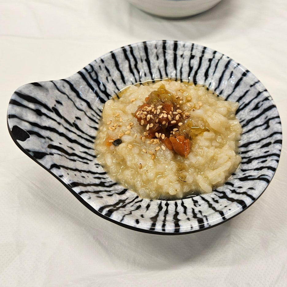 잠시 기다리니, 바로 준비가 되는 음식들. 가장 먼저 나온 건 죽. 참기름의 향이 좋았다. 특히 고명으로 올라가있던 묵은지의 맛과 아삭함이 죽과 아주 잘 어울렸다. 맛있는 죽을 먹으니 입맛이 살아나는 느낌. 더 배가 고파진다.
