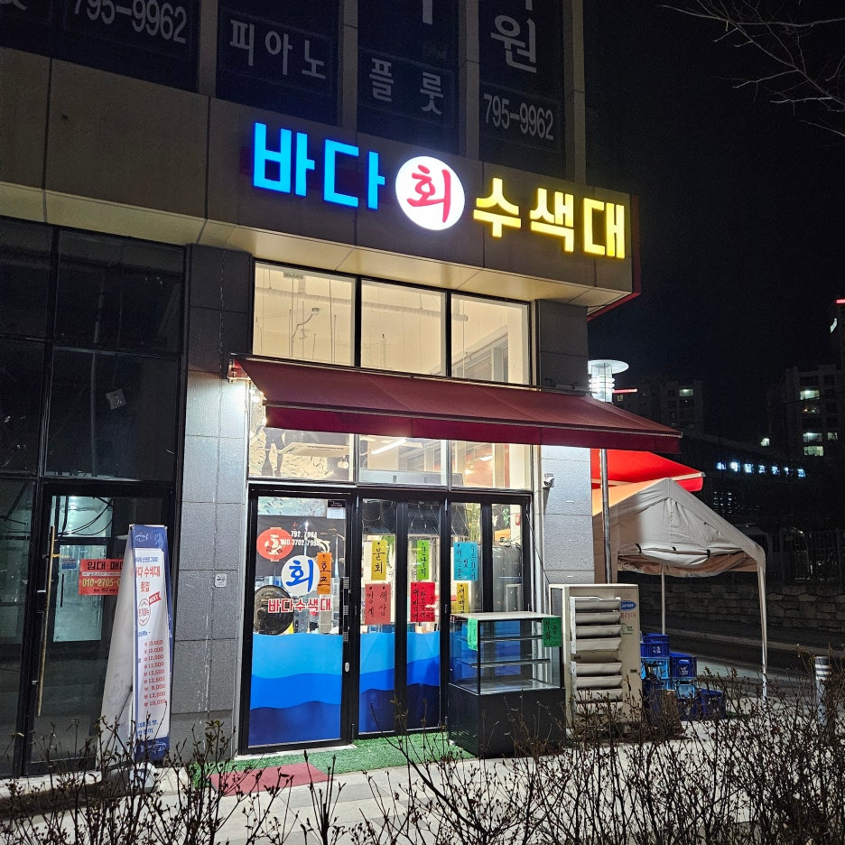 상가 건물 1층에 위치한, 바다 수색대. 간판에는 "바다" 회 "수색대"라고 되어 있어서, 바다회수색대가 가게명인줄 알았더니, 네이버 검색을 해보니 그냥 바다수색대였다. 넓지 않고 6개 정도의 테이블로 구성되어 있는 전형적인 동네 횟집이었다.