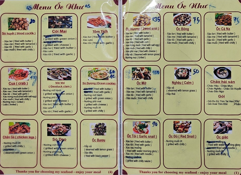 자리에 앉으니, 바로 가져다주는 메뉴판. 메뉴에는 영어로도 적혀 있어서, 알아볼 수는 있다. X 표시는 오늘 안되는 메뉴들을 이야기하는 듯했다. 기본적으로는 재료를 고르고, 그 재료를 어떤 방식으로 조리를 할지가 적혀 있는 모습이었다.