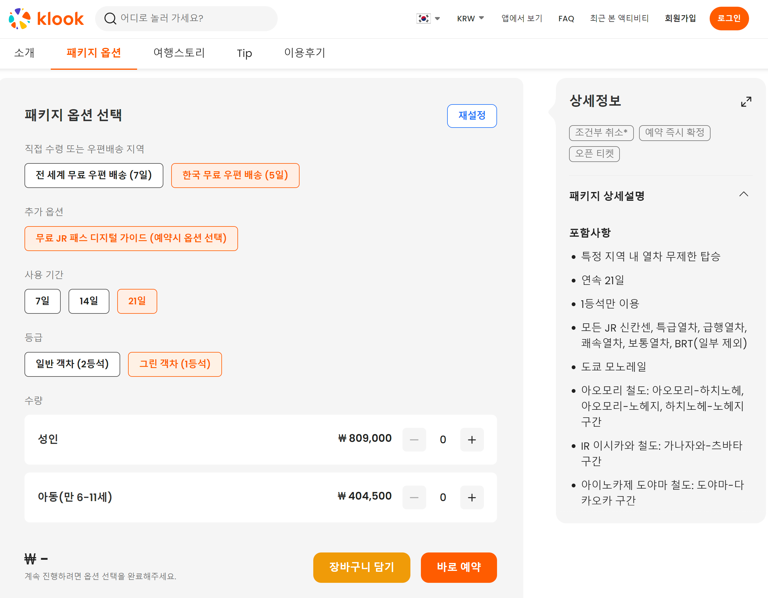 클룩에 들어가서 "일본 전역 JR 패스"를 검색하여 아래 화면에서 구매할 수 있다.