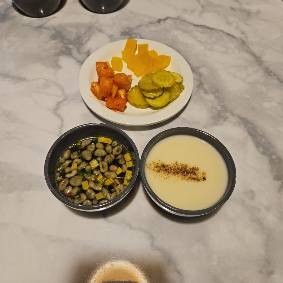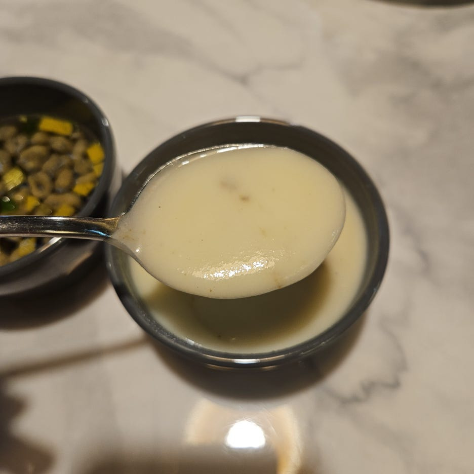 돈가스를 기다리면서 셀프바를 제대로 털고 왔다. 수프와 우동국물. 그리고 단무지, 피클, 깍두기까지.