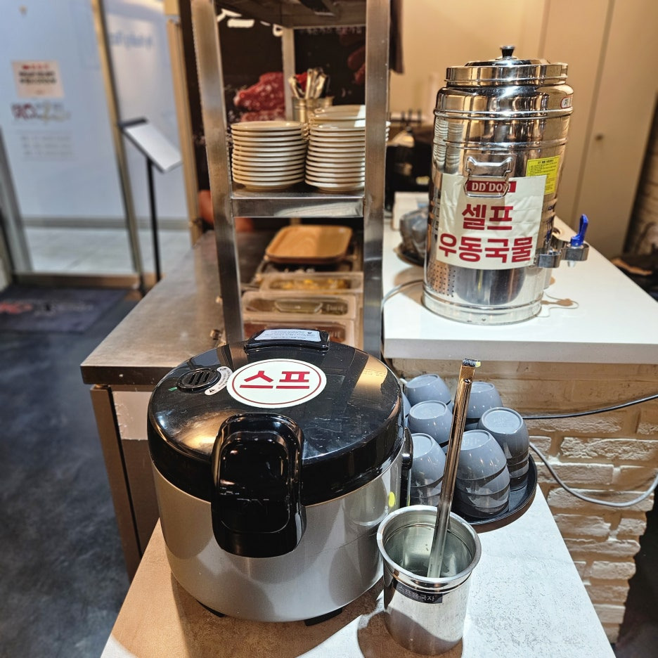 입구 쪽에는 셀프바도 있어서, 수프와 우동 국물을 마음껏 먹을 수 있었다.