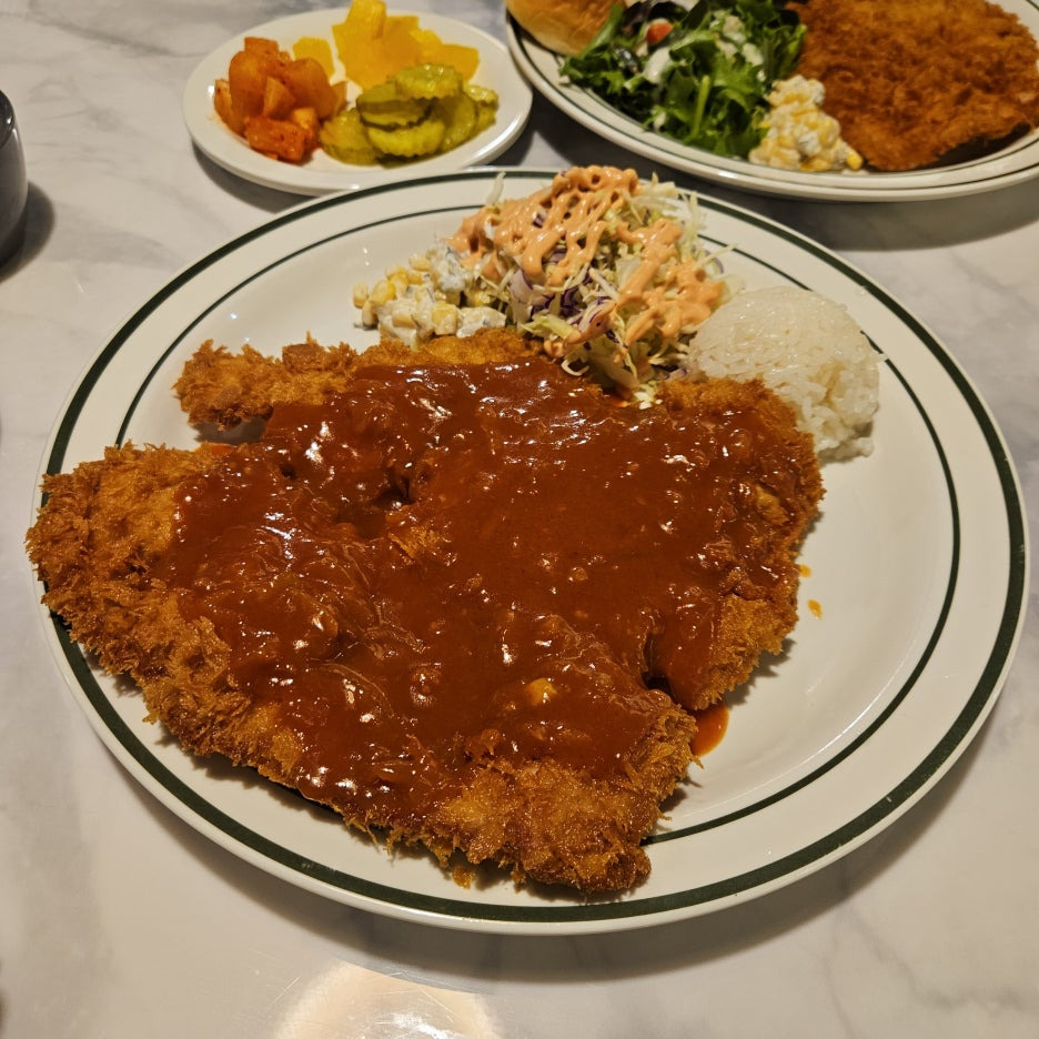 돈가스와 케요네즈 소스가 올라간 샐러드. 그리고 콘샐러드까지 완벽한 구성. 돈가스의 크기도 상당히 컸다. 이 가격에 이 정도의 양과 퀄리티면 아주 훌륭한 듯.