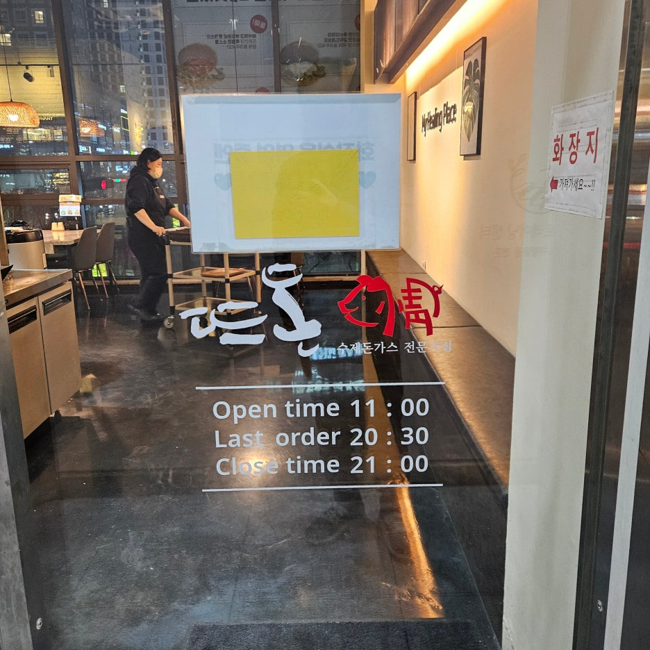 이곳은 프랜차이즈로 운영되는 돈가스 전문점이었던 것 같다. 건물 2층에 자리하고 있어서, 눈에 아주 잘 띄는 곳은 아니다. 하지만, 유심히 건물을 보면서 걷다 보면, 커다란 간판이 보이기는 한다. 네이버에는 라스트 오더가 오후 9시로 되어 있지만, 실제로는 조금 더 일찍 마감을 한다고 생각을 해야 한다. 내가 방문했을 때에도 8시 30분 정도가 되니, 마감을 하는 상황이었다.