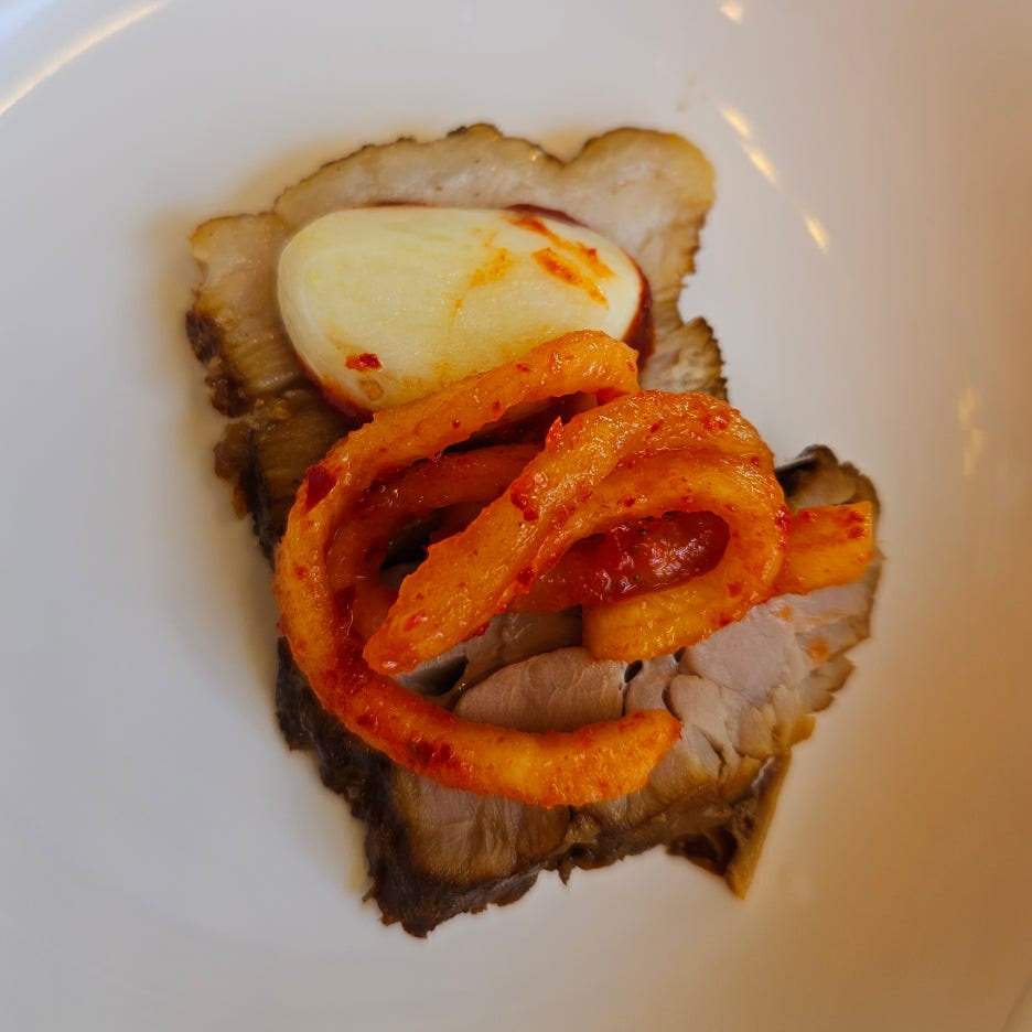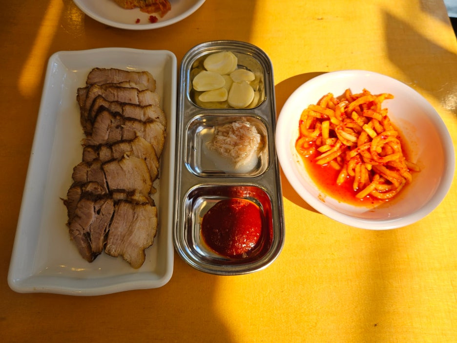 마늘에 고추장을 찍어, 편육 위에 턱 올리고, 상큼하고 달달한 무생채를 올려먹으면, 이 조합이 아주 훌륭하다. 고기 자체의 맛이 조금 떨어지더라도 이렇게 먹으면 모든 걸 극복할 수 있는 맛이 된다.