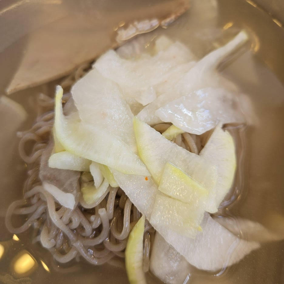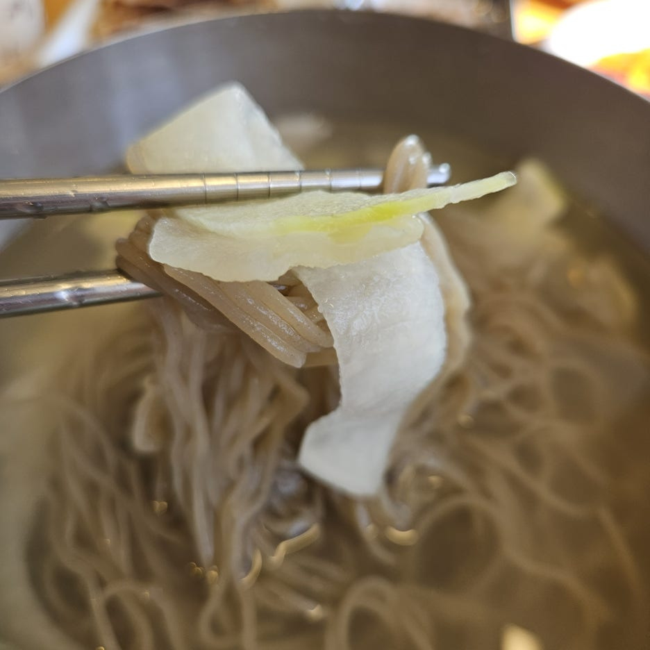 살살 면을 풀어서 먼저 육수부터 한입. 첫맛은 고기 육수의 맛이 느껴지면서 입안을 채우고, 마지막으로 달달한 느낌의 동치미 국물의 느낌이 확 살아난다. 나는 이 끝맛의 청량함을 가장 사랑한다.