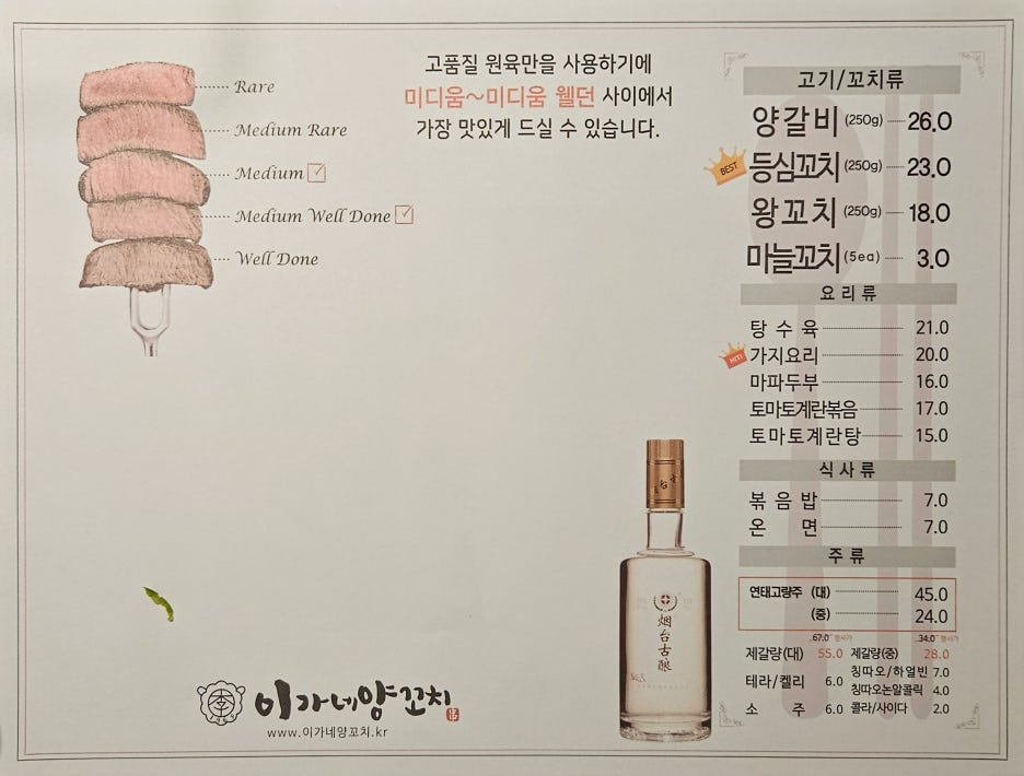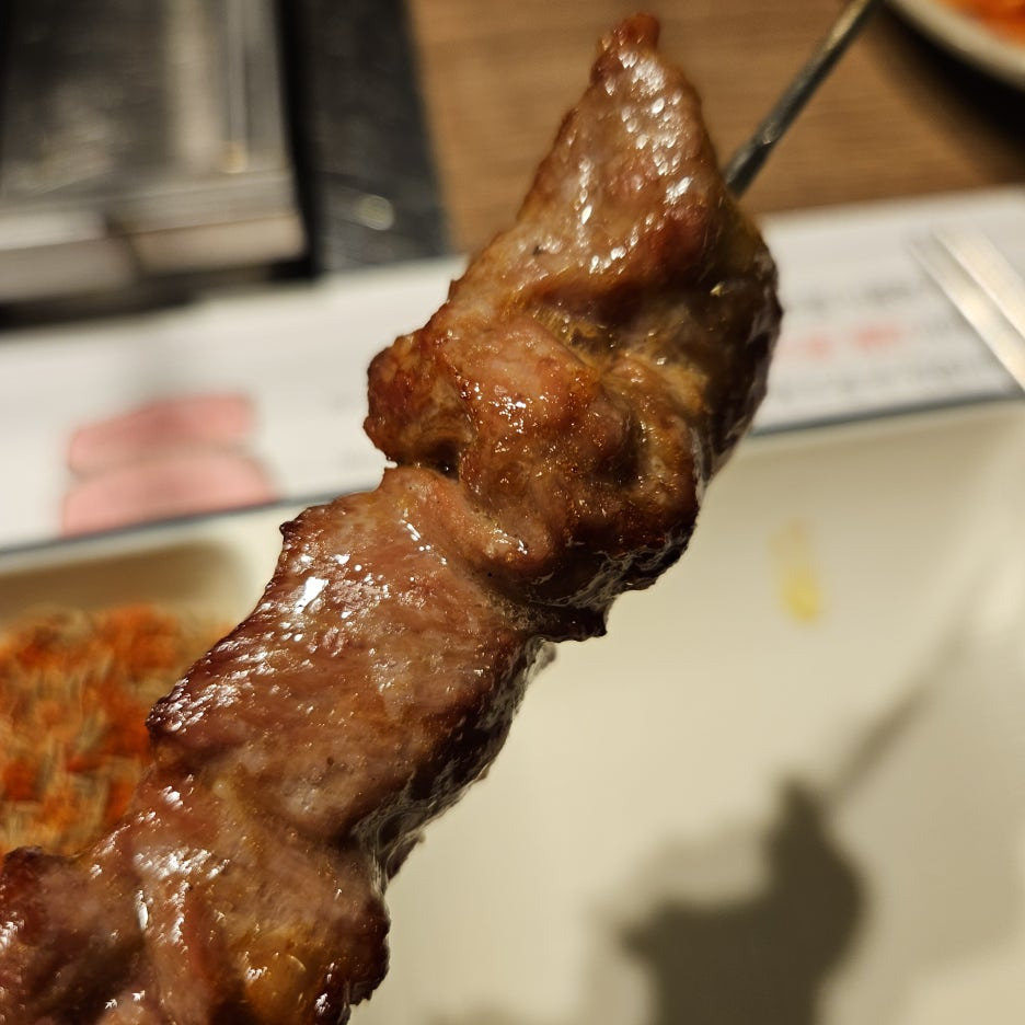 이가네 양 꼬치에서 등심 꼬치를 먹을 때는 꼭 미디엄 정도로 맛봐야 한다. 이 정도 굽기에서 먹으면, 거의 투뿔 소고기 이상의 맛은 내기 때문. 조금 많이 구우면 이런 맛이 사라진다.