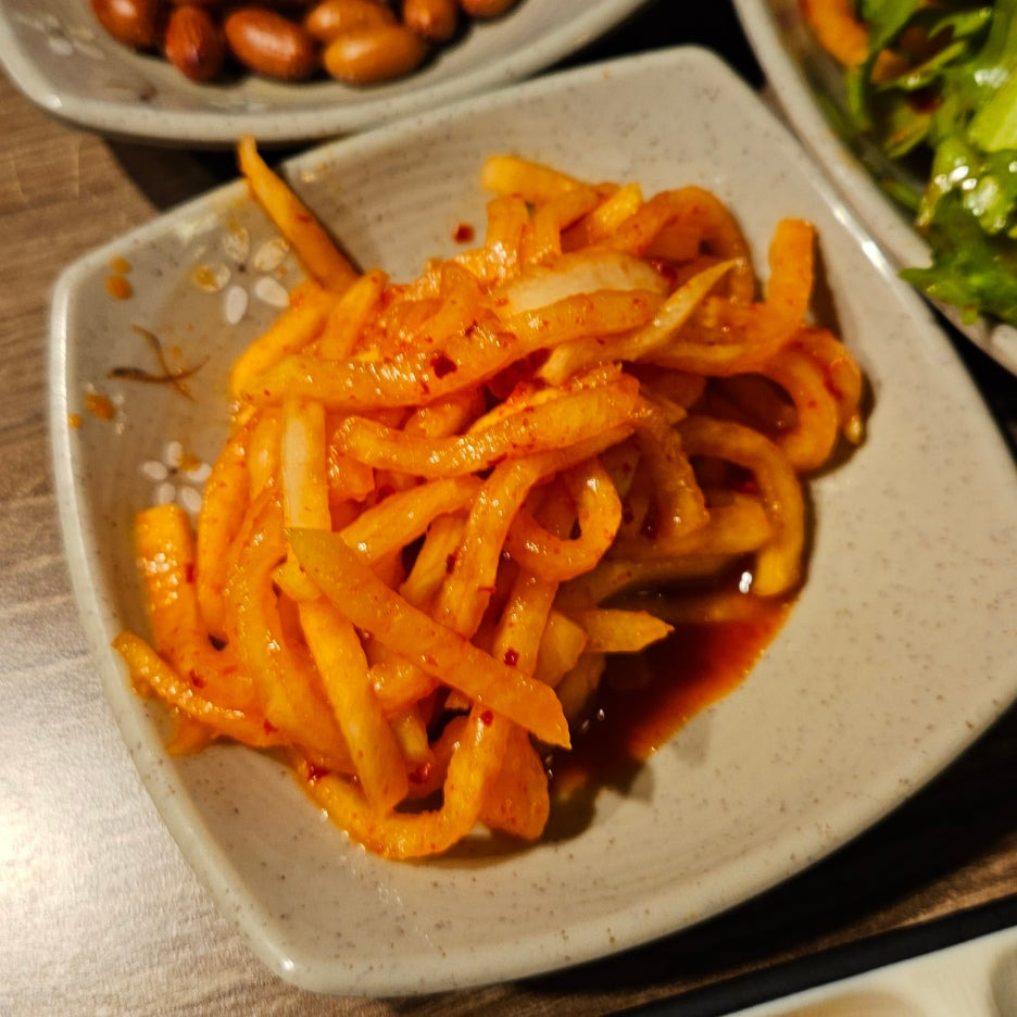 최소 3번 정도는 리필해서 먹는 무생채의 맛도 상쾌하다.