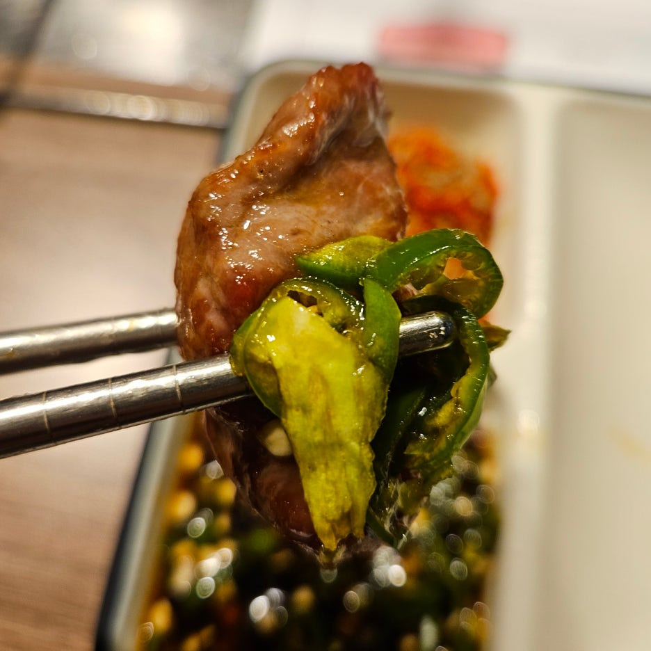 이가네의 시그니처인 간장 고추와 함께 한 입. 역시 쫄깃하면서도 부드러운 식감이 훌륭하다. 씹을수록 고소한 고기 맛은 그 어떤 양 꼬치도 이길 수 없는 최고의 맛.