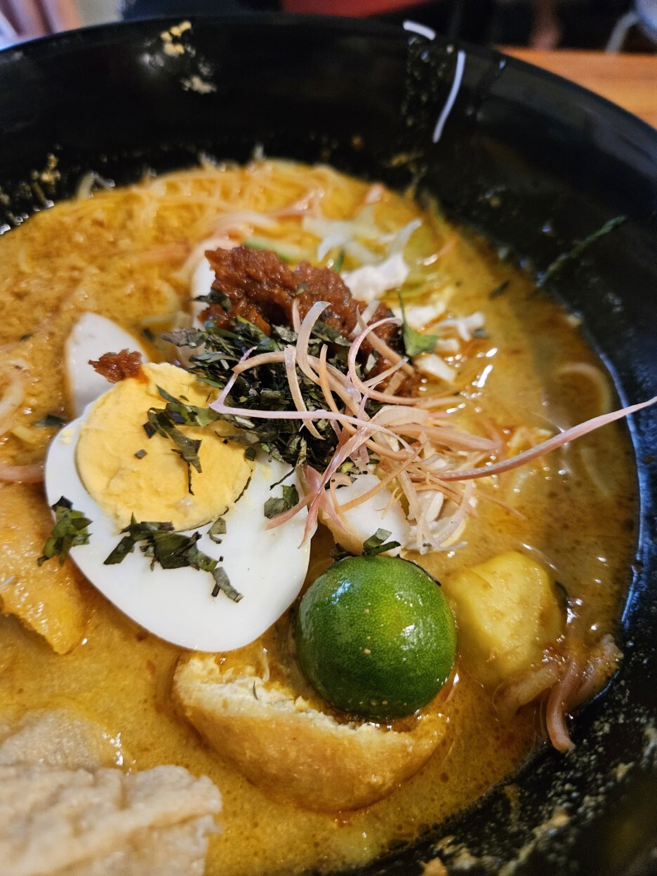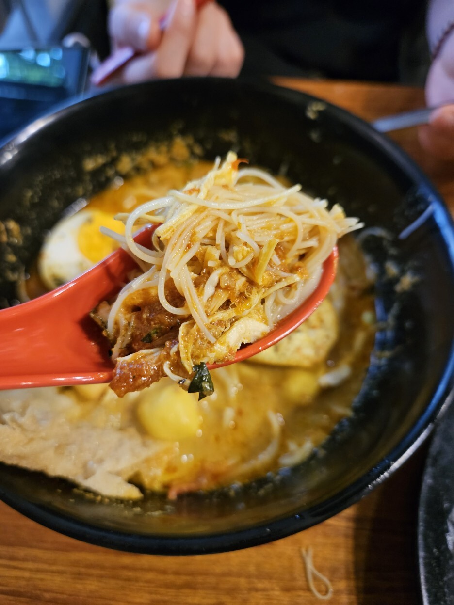 나의 기억에 가장 맛있게 남아있는 락사는 코타키나발루의 이펑에서 먹은 락사이다. 코코넛크림이 들어간 살짝 매콤한 맛을 처음 경험했던 터라, 꽤 충격을 받은 맛있는 맛. 그 이후 오랜만에 먹는 락사였기에 상당히 기대를 하면서 먼저 뇨냐 락사를 먹어보았다. 일단 다양한 재료가 들어가 있는 모양새는 이펑 락사 보다 훨씬 훌륭하다.