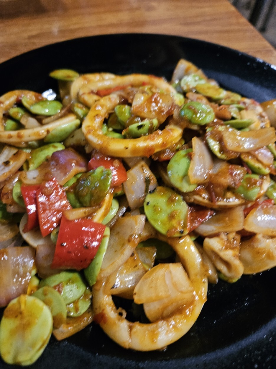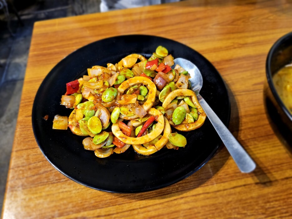 재료의 30% 정도를 차지하는 콩을 먹어 본다. 보기에는 조금 납작한 완두 콩일 뿐이었는데, 너무 놀라운 맛이었다. 엄청 쓰다. 써도 이런 쓴맛이 없다. 이 쓴맛이 다른 모든 맛들을 밟고 올라서서 입안의 느낌을 평정해 버린다. 다른 채소들은 일반적인 맛이다. 결국 콩은 다 남겼고, 오징어와 양파 위주로 먹게 되었다.