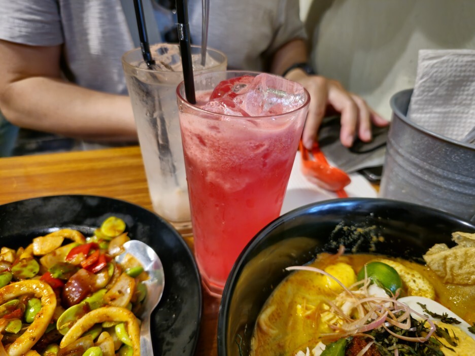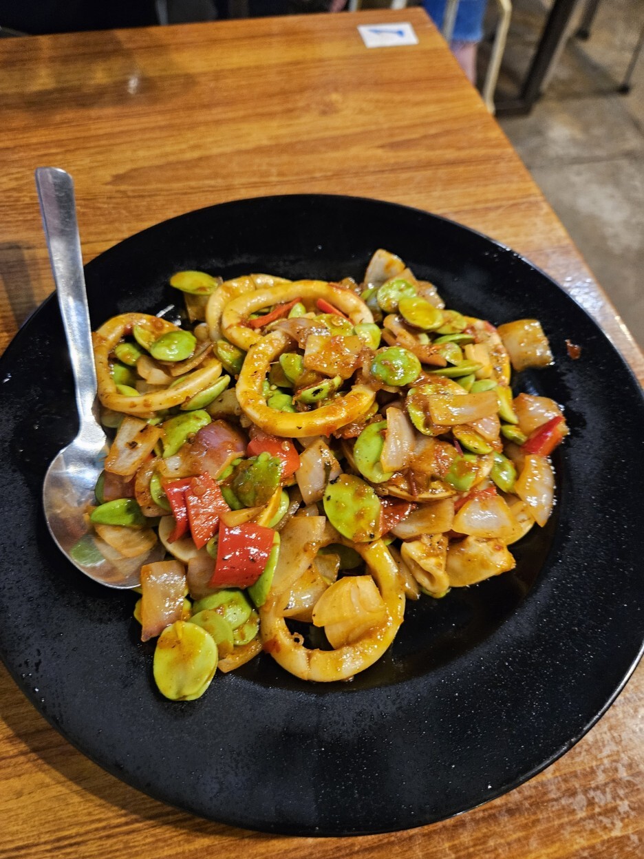남은 한자리를 차지하고 메뉴를 훑어 보았다. 일단 기본적으로 뇨냐 락사는 정해진 메뉴였고, 추가로 뭘 먹을지 고민을 했다. 눈에 띈 것이 시푸드 요리 중, 삼발 페타이. 찾아보니 삼발 소스와 콩 요리였다. 추가로 오징어나 새우를 선택해서 먹을 수 있었다. 나는 오징어를 선택했다. 그리고, 수박주스와 리치 주스도 함께 주문했다.