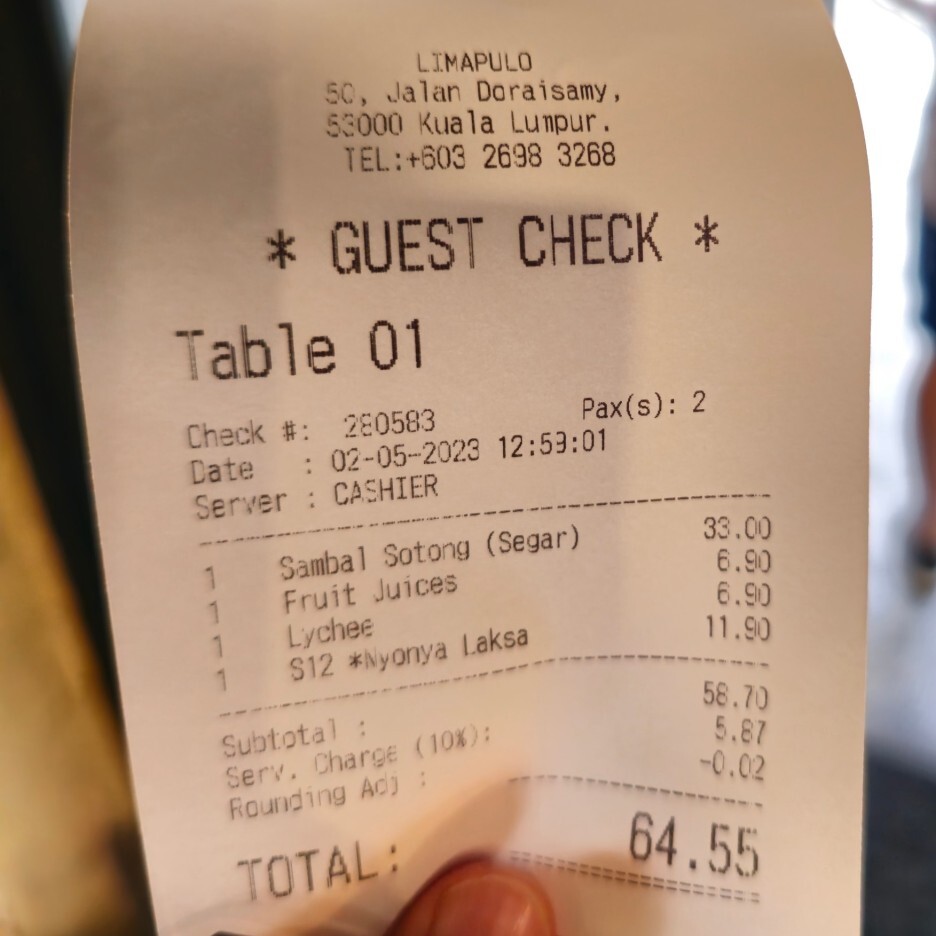 여긴 메뉴의 음식 가격에 10%의 서비스 차지가 추가로 붙는다. 총 2만 원 안되는 가격이었다. 말레이시아 물가 치고는 살짝 높은 느낌이 들기도 한다. 아무래도 좀 고급 진 곳이라 그런듯하다.