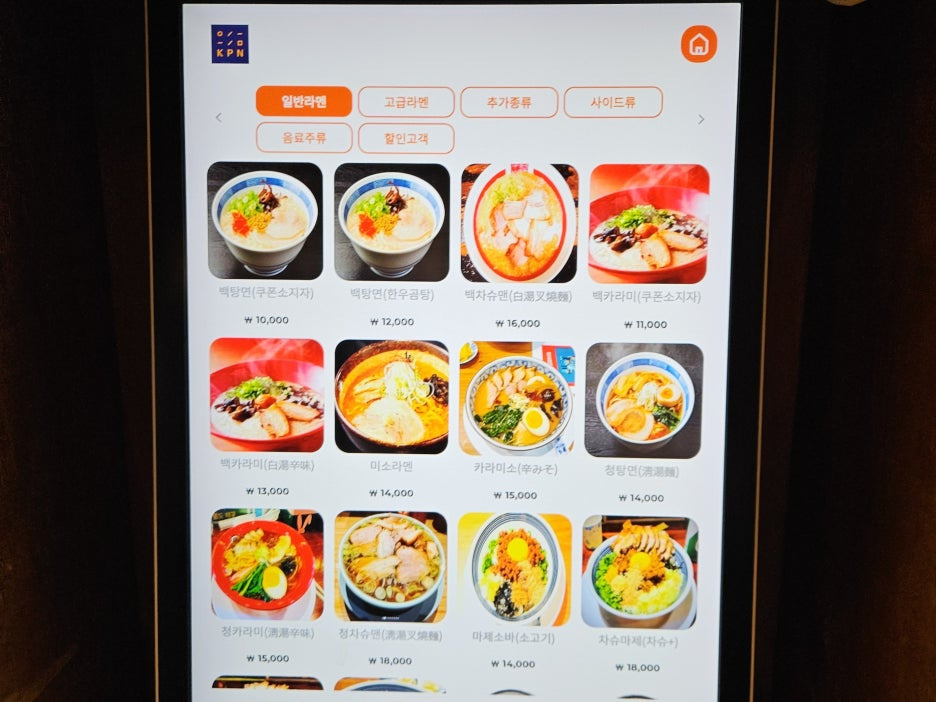 자리에 앉기 전 주문부터. 키오스크에서 주문을 하는 방식. 우리 뒤에 바로 새로 들어온 손님이 기다리고 있었기에 메뉴 사진을 다 촬영하지는 못했고, 메인 메뉴 페이지만 한 컷. 백카리미 라멘과 처음 먹어보는 마제소바로 주문 완료.