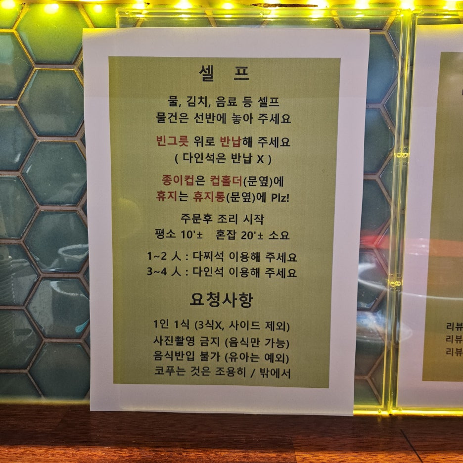 다소 무서워 보이는 안내 문구가 자리마다 붙어 있다. 1인 1식은 알겠는데, 3식 X. 이건 많이 시키면 안 된다는 뜻으로 해석된다. 사진도 음식만 찍어야만 한다. 거기에 그리 친근하지는 않은 접객. 맛있는 음식이지만 손님들의 마음을 위축시키는 여러 가지 상황들이 만들어져 있는 곳이기도 하다.