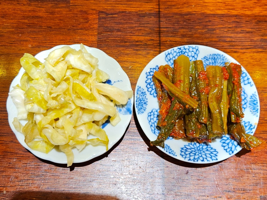 양배추 절임과 갓김치. 둘 다 맛있고, 살짝 느끼한 라멘에 아주 잘 어울린다.