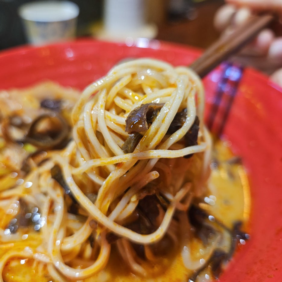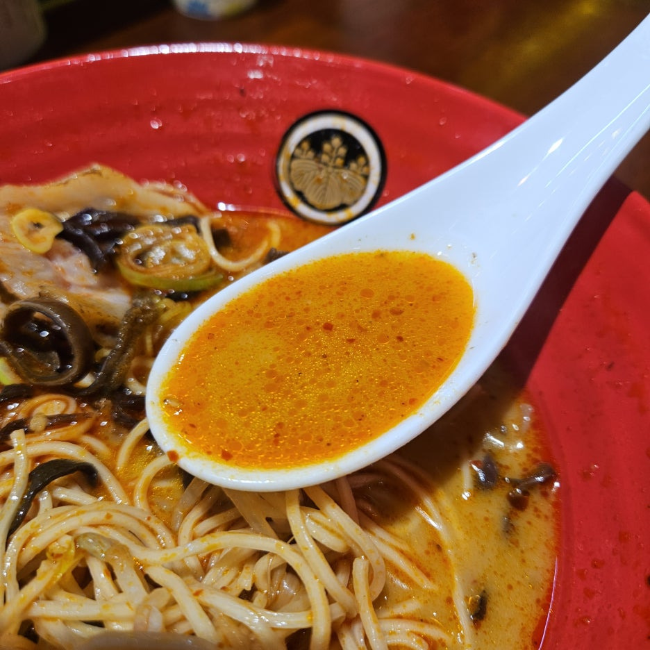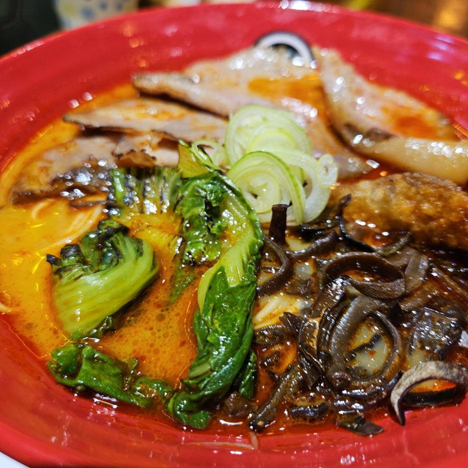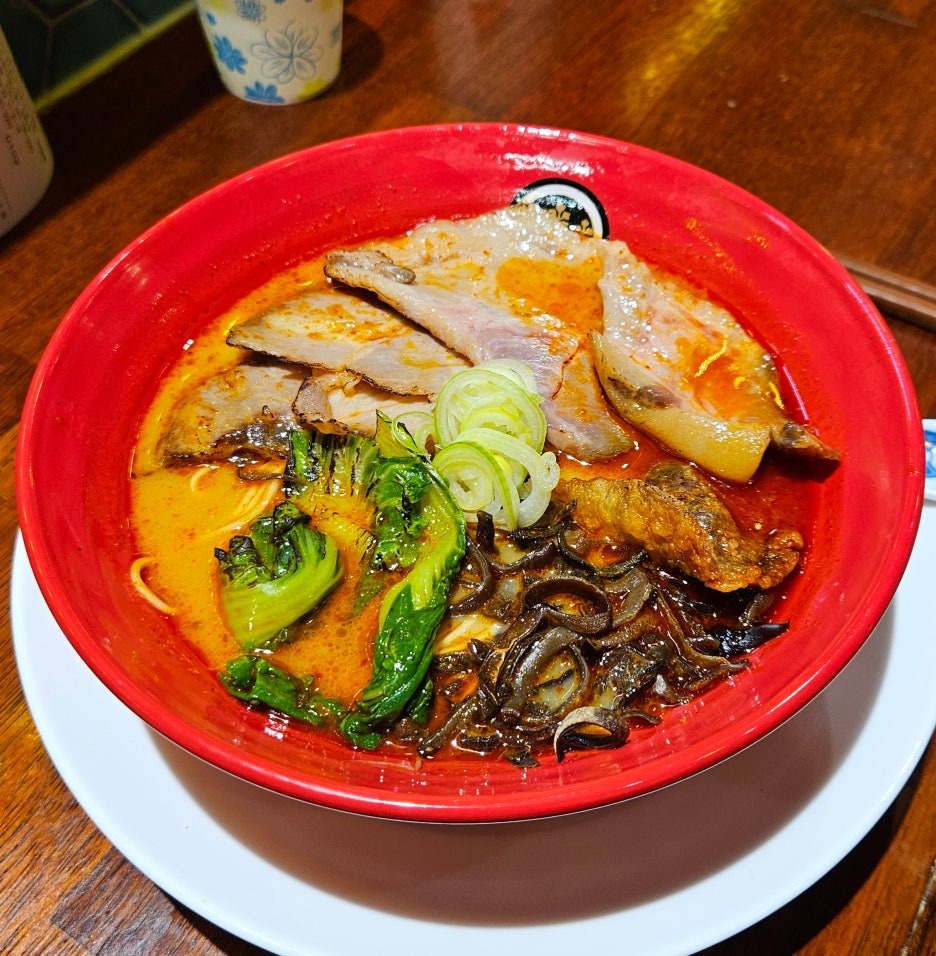 백탕 라멘의 매운 버전. 모양새는 아주 훌륭하다. 목이버섯, 차슈, 파, 청경채가 토핑으로 올라가 있는 붉은 국물.