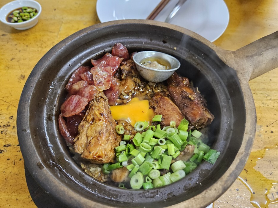 잠시 후 받아 본 빕구르망 클레이팟 치킨라이스. 아주 뜨겁다. 다양한 닭고기와 중국식 소시지가 올라가 있고, 작은 종지에 들어가 있는 것은 발효된 생선이다. 이 녀석이 우리나라의 젓갈과 같은 역할을 한다.