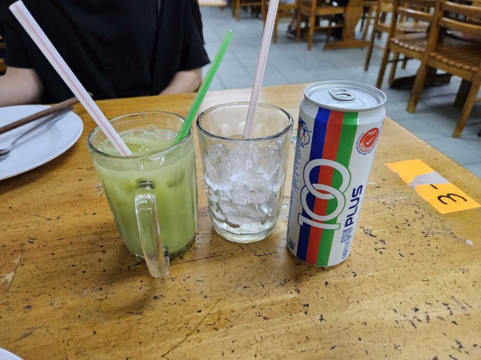 자리를 잡고 잠시 기다리니 주문한 음료를 먼저 받았다. 말레이시아에서 유명한 탄산음료인 100 Plus와 엄브라 자두 주스 (umbra juice with sour plum)이다.