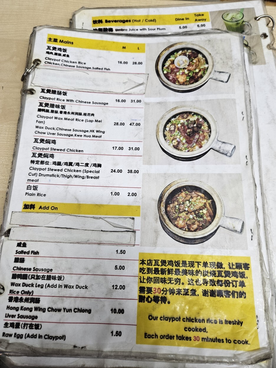 클레이 팟 치킨라이스 Claypot Chicken Rice (M): 16링깃 / 4,800원
