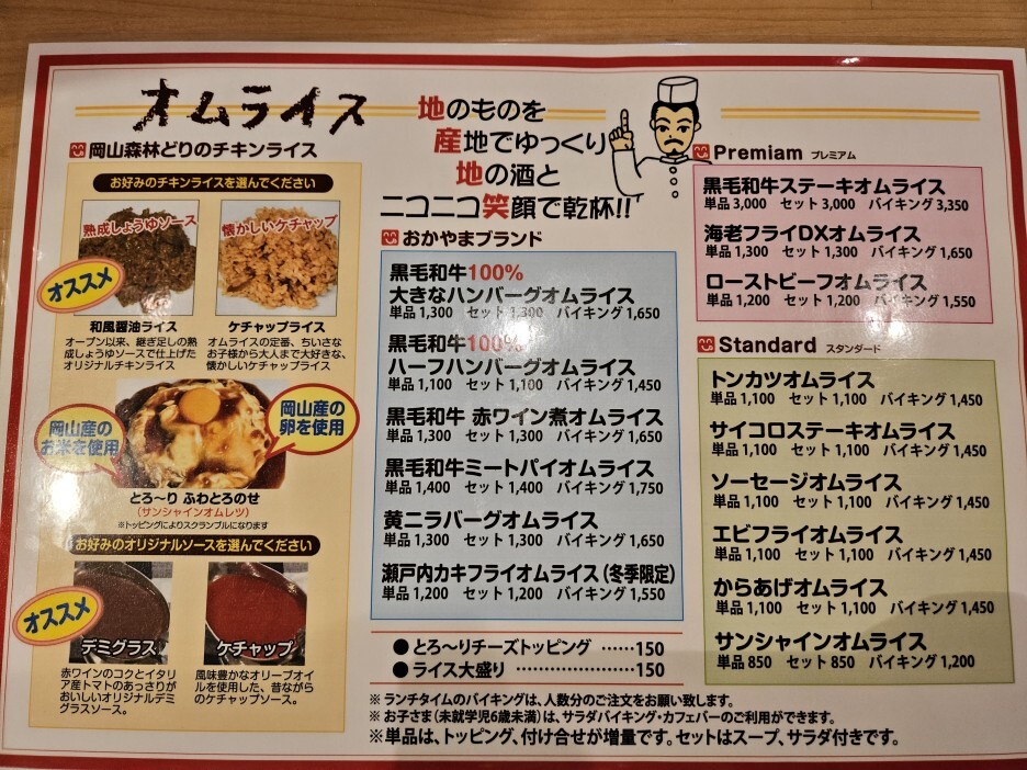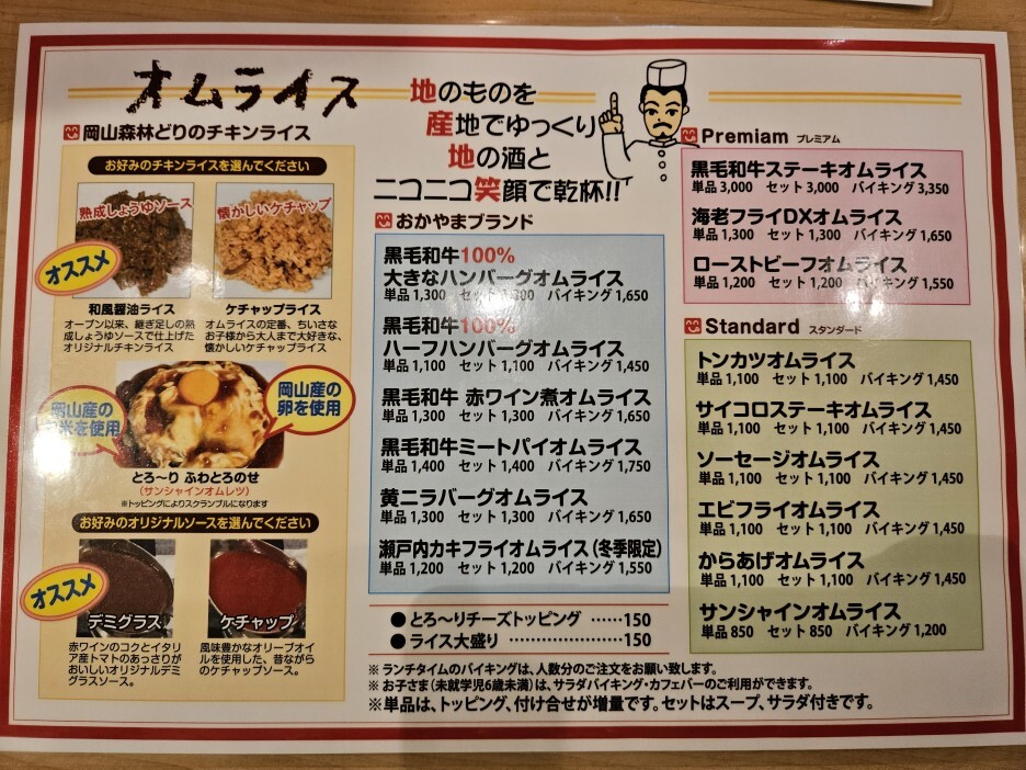 라이스는 숙성 간장 또는 캐찹 두 가지 종류 중에 선택이 가능하고, 오므라이스 소스도 데미그라소스 또는 케첩소스 중 선택할 수 있다. 쌀과 달걀도 오카야마산을 사용한다고 되어 있다.