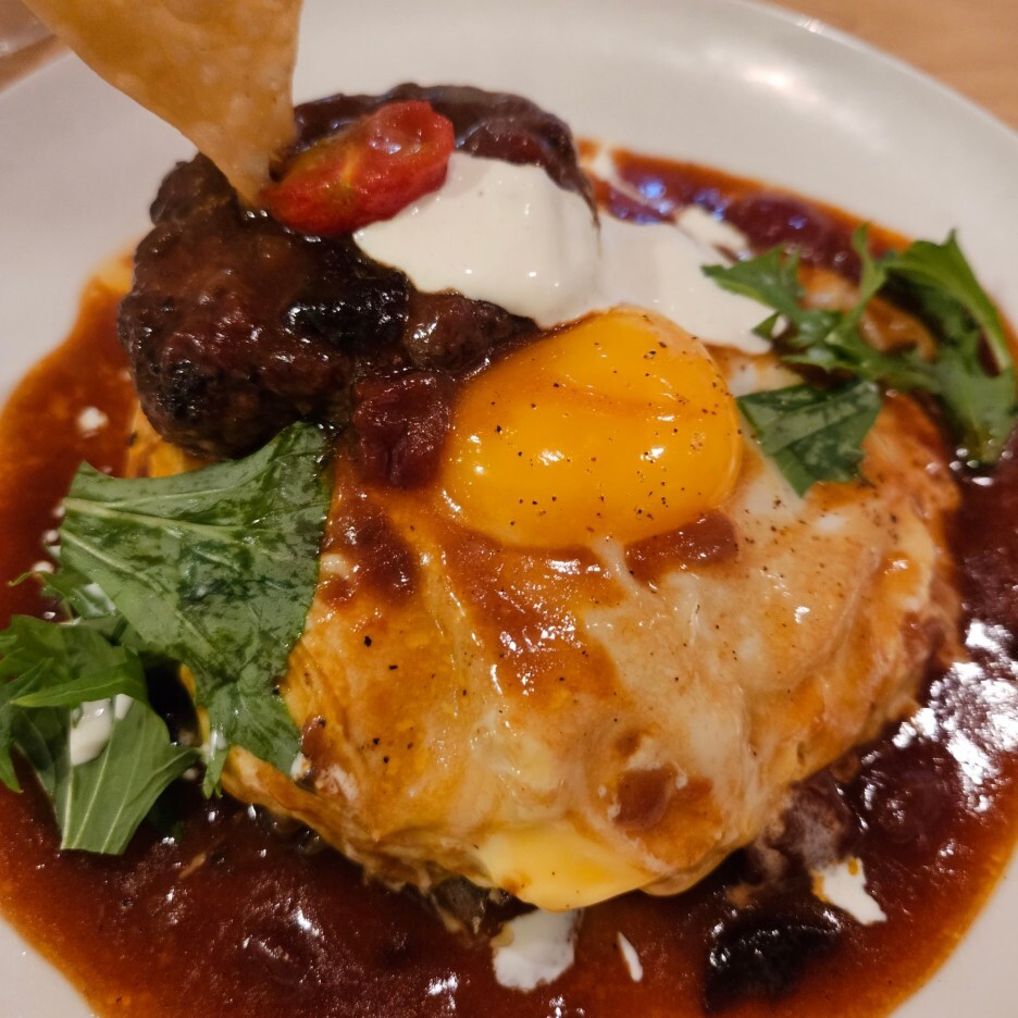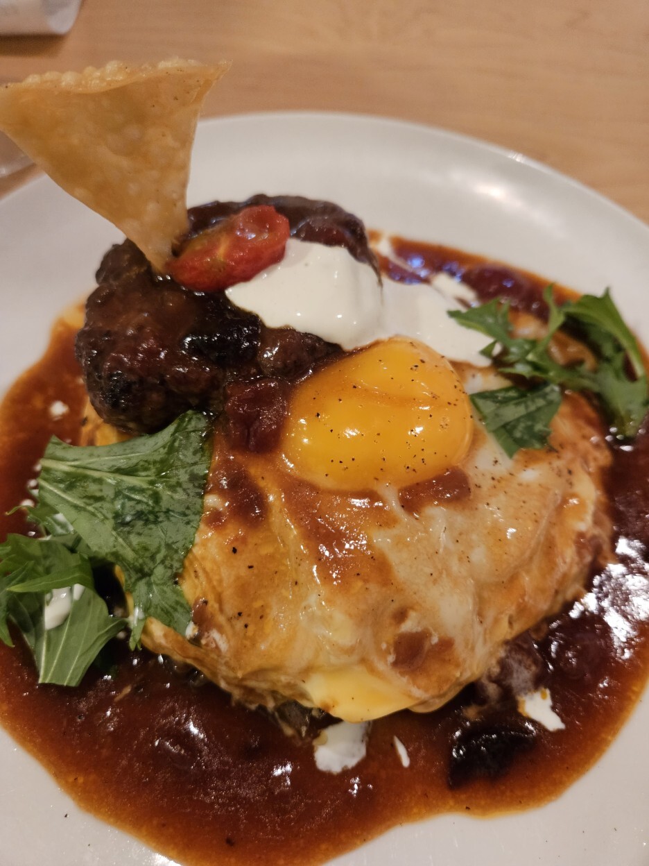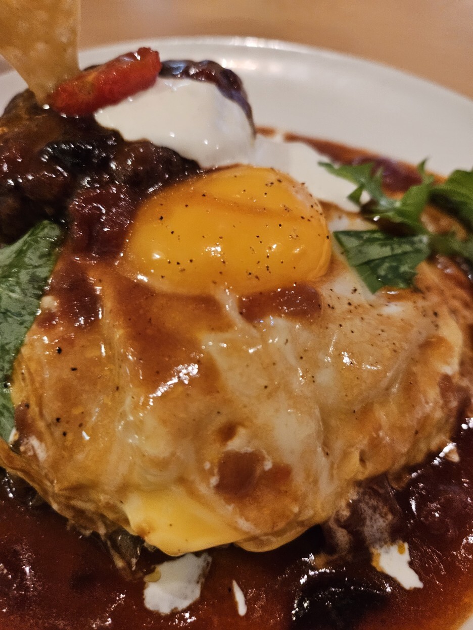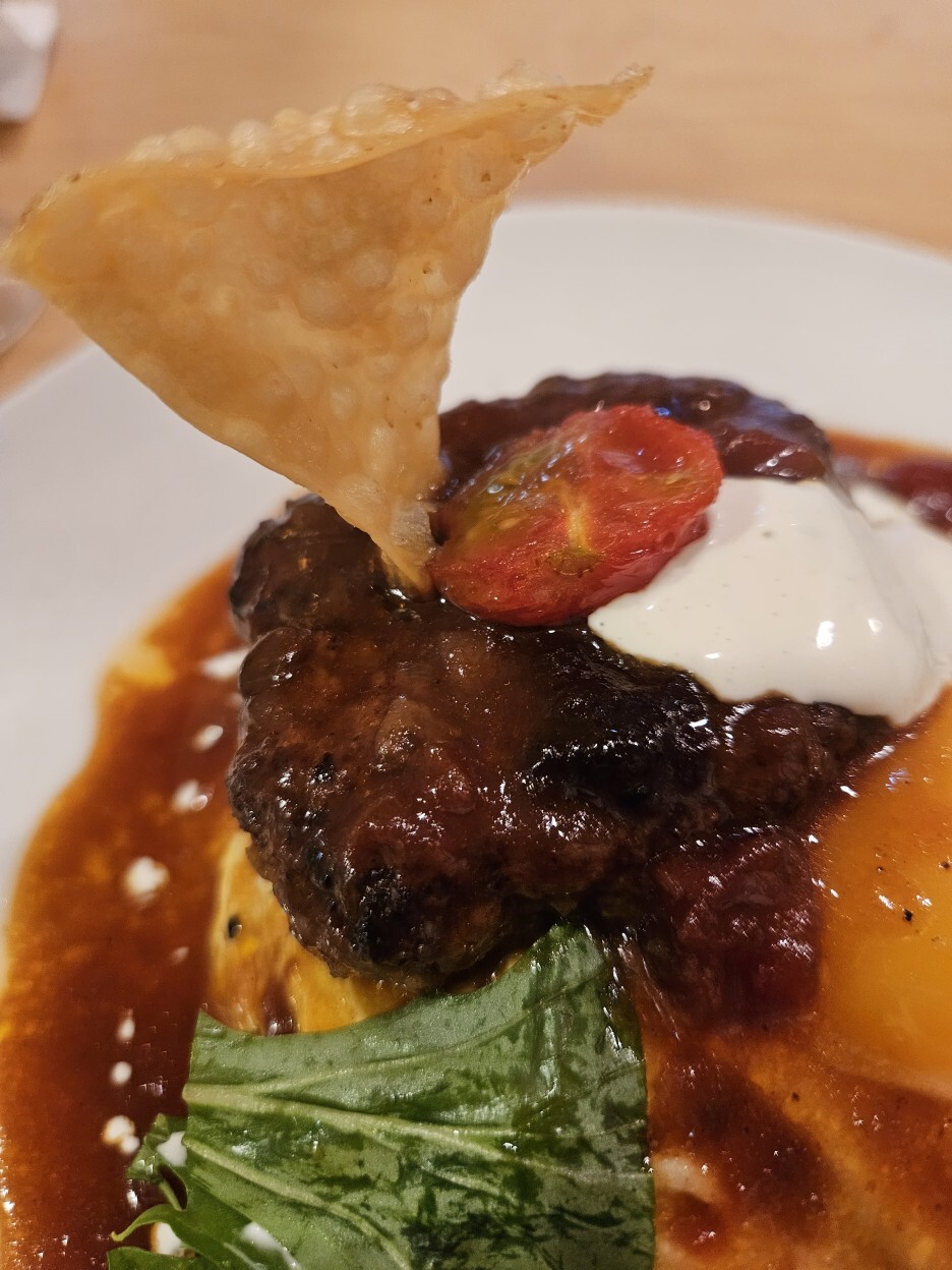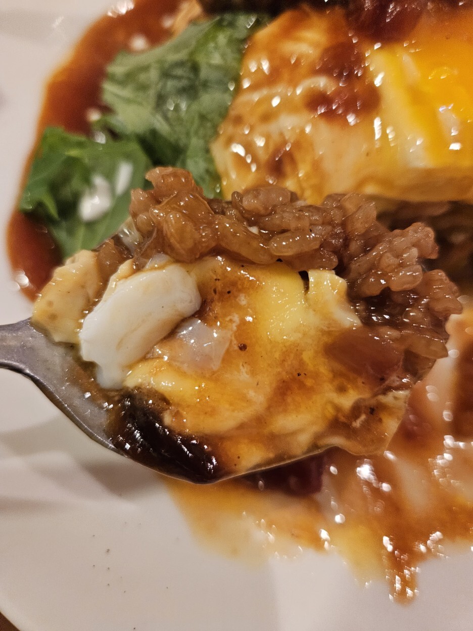 드디어 나왔다. 하프 함박 오므라이스. 함박의 고기는 와규 100%라고 하며, 고급 소고기인 흑모 와규이다. 함박에 꽂혀있는 나쵸 한 조각이 재미있다. 그리고, 시선을 끄는 것은 오므라이스를 덮은 계란 위에 또 노른자가 딱 올라가 있는 모습이다.