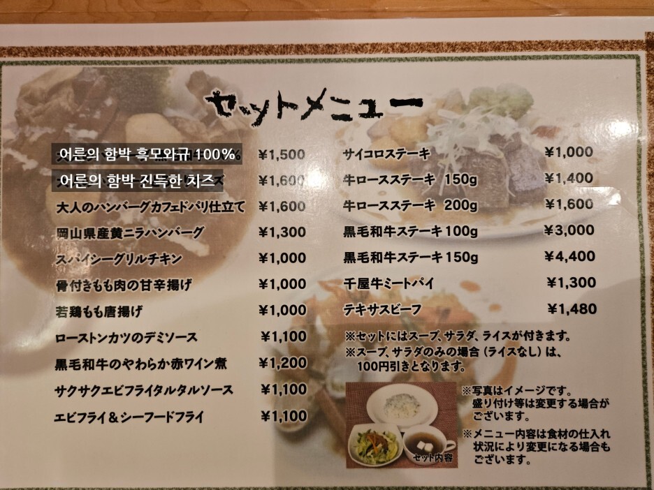 정말, 이번 일본 여행에서 지금까지 약 1주일간 먹어본 음식 중에 최고의 탑이었다. 함박은 정말 잊을 수 없는 맛이다. 기본 함박은 1,500엔에 단품으로 판매를 하고 있고, 다양한 베리에이션 버전의 함박도 있다. 오카야마를 방문할 계획이 있으시다면, 꼭 여기 니코니코 키친 썬썬에 방문하셔서 함박을 드셔보시길 강추 한다.