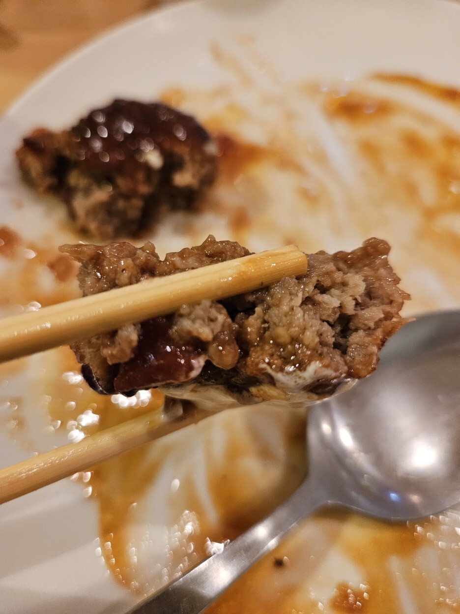 젓가락으로 으스러지듯이 잘리는 함박은 너무 퍼석하지 않을까 걱정했는데, 눈으로는 몰랐는데 한입 먹으니 육즙이 입안에 가득 차면서 느껴지는 고기의 풍미가 정말 어디서도 맛볼 수 없었던 맛이다.