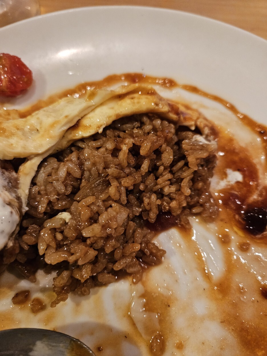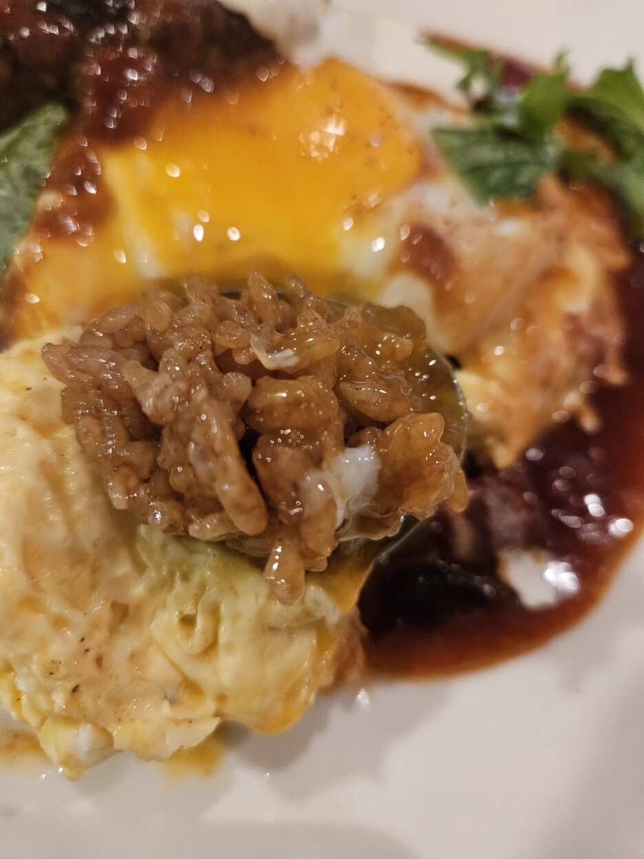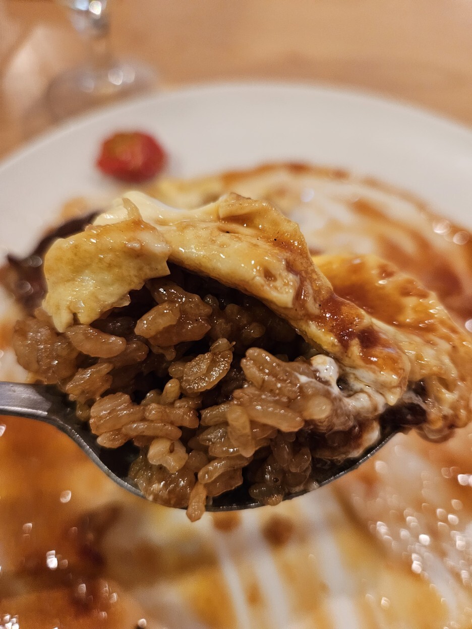 계란 위에 있는 노른자를 터트려서 한 숟가락 떠 본다. 라이스는 일본풍 간장 소스를 선택했다. 케첩과는 다른 풍미를 주면서 감칠맛도 훌륭하다. 거기다 노른자가 코팅이 되니 더욱 고소하다. 훌륭하다.