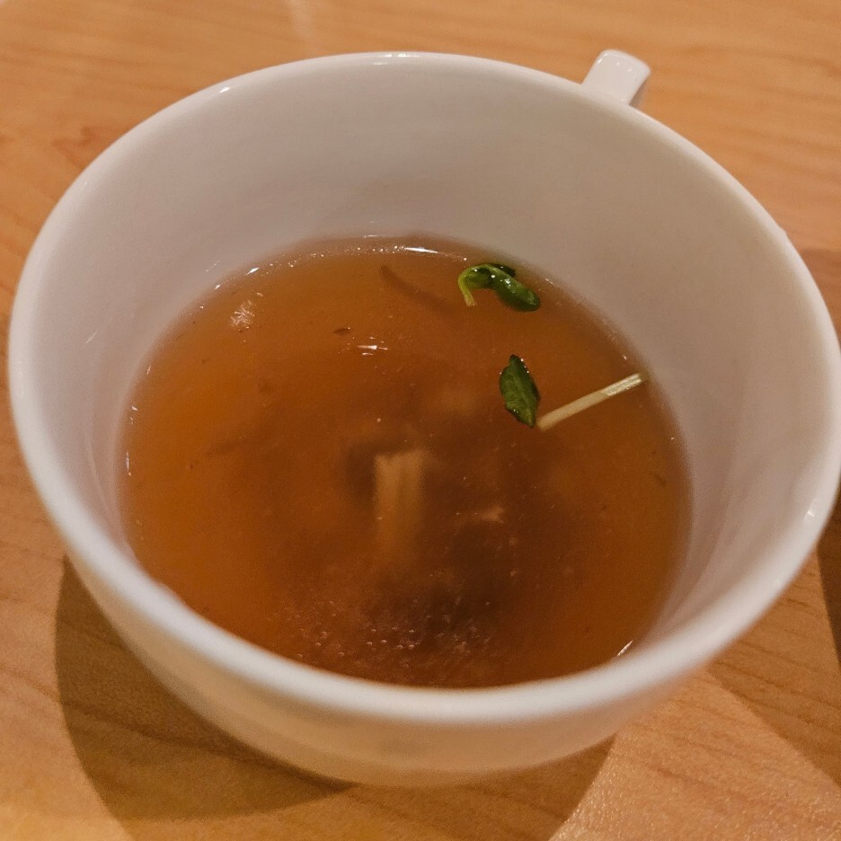 먼저 나온 것은 콘소메 스프. 전형적인 일본식 옥수수 국물이다. 살짝 기름기가 있지만 아주 고소하다.
