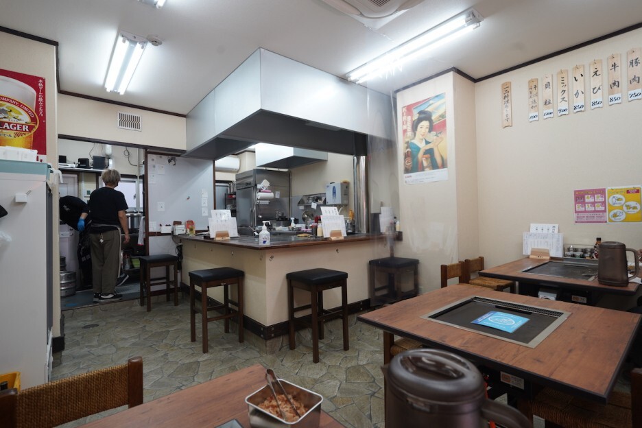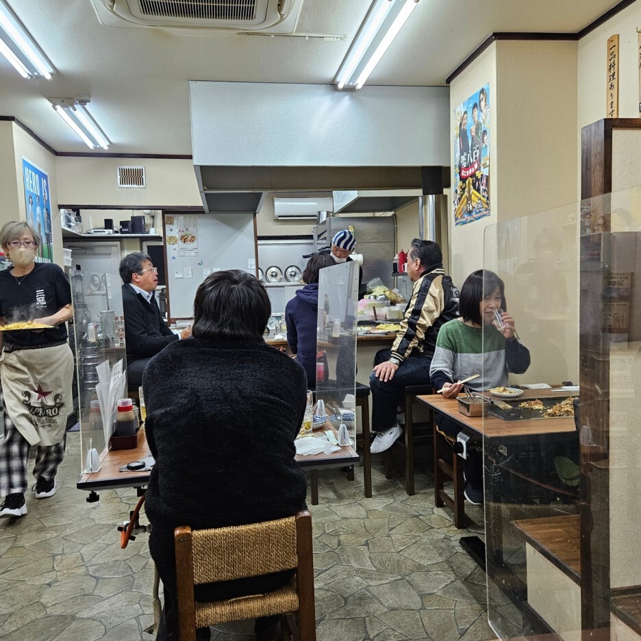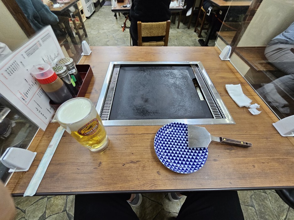 오코노미야키 카몬 S는 아주 작은 규모이다. 카운터 좌석을 포함해서 대략 24석 정도밖에 되지 않는다. 조금 늦은 저녁 8시쯤 방문을 했고, 1명이었음에도 잠깐 5분 정도 대기를 했다. 딱 내가 도착했을 때 한 손님이 일어섰기에 가능한 일이었다. 내 뒤에 온 손님들은 30분 넘게 대기를 하는 모습이었다.