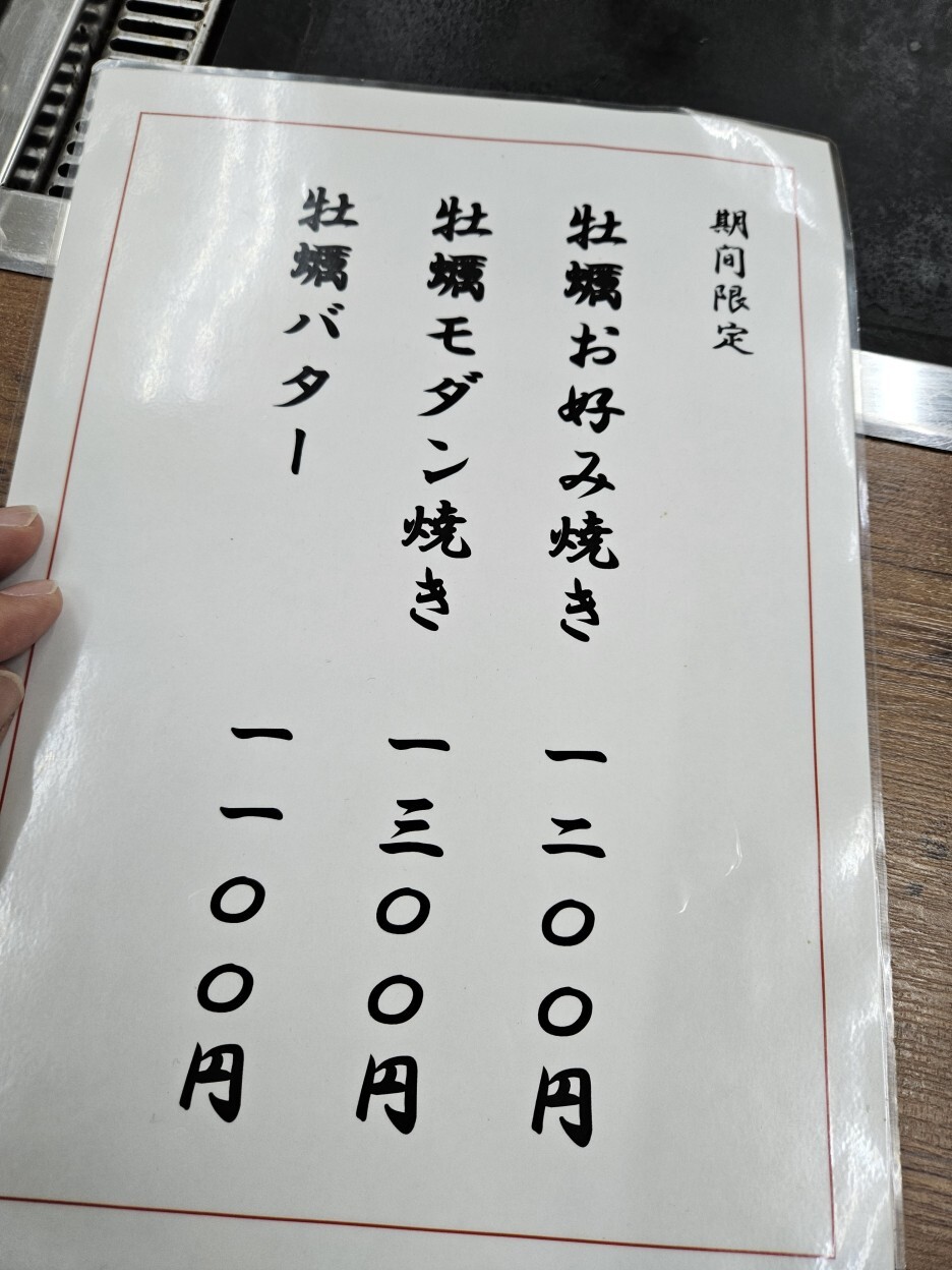 기간한정 굴오코노미야키 1200엔, 굴모단야키 1300엔 , 굴버터 1100엔