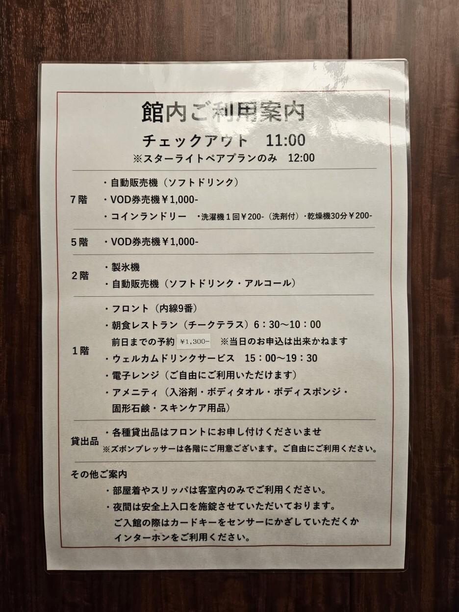 엘리베이터에 붙어 있는 시설 안내 내용. 7층에 자판기와 코인세탁기가 있고, 2층에 제빙기, 자판기(술)이 있다. 체크아웃은 11시.