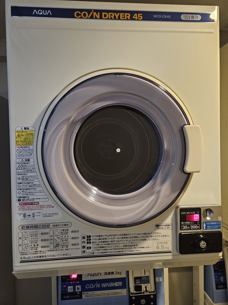 코인세탁기는 통돌이 세탁기이고 30분 200엔. 정말 싸다. 일본 여행 모든 곳 중 가장 저렴한 가격이었다. 여기서 세탁을 했었어야 했다.