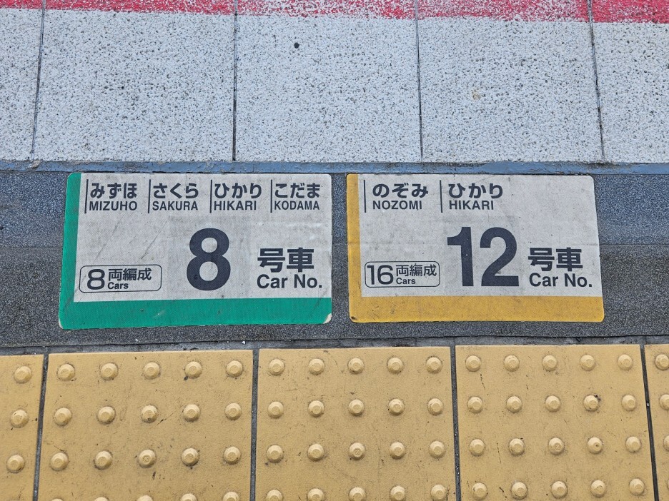 참고로, 신칸센이 정차하는 플랫폼에는 정확하게 차량 호수가 바닥에 쓰여 있다. 자신이 타는 열차 종류를 알고 있다면 미리 대기가 가능하다.