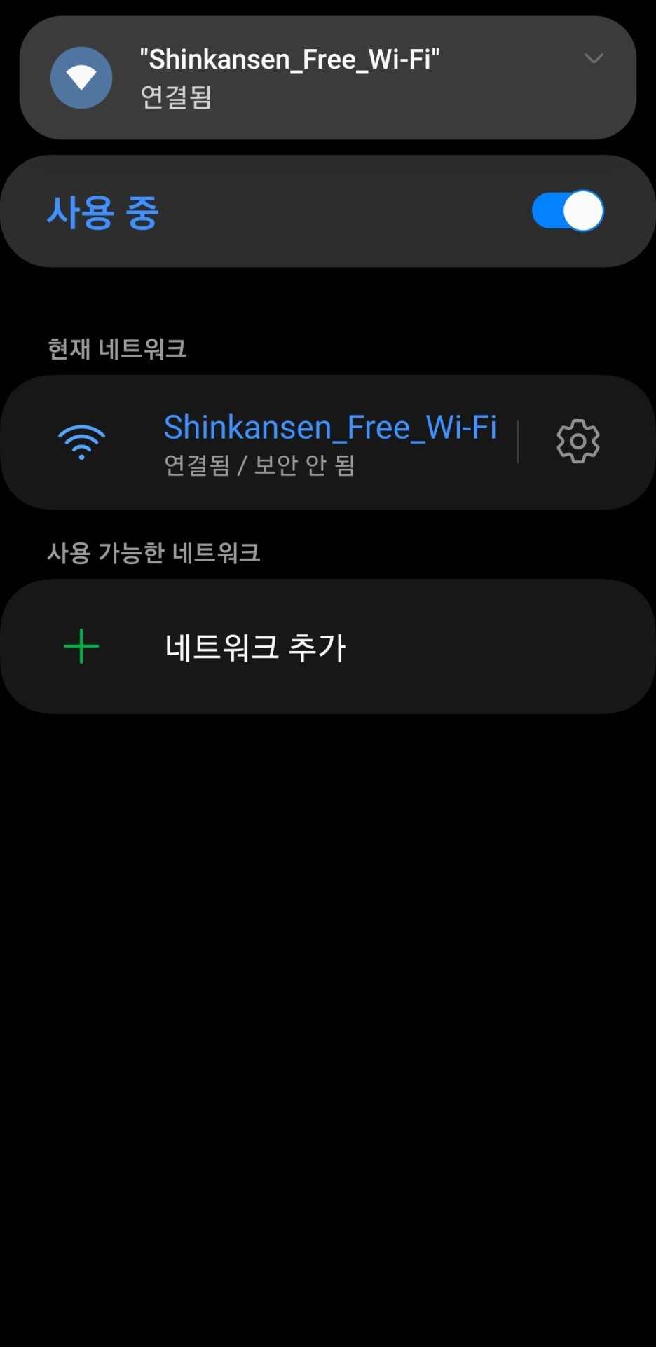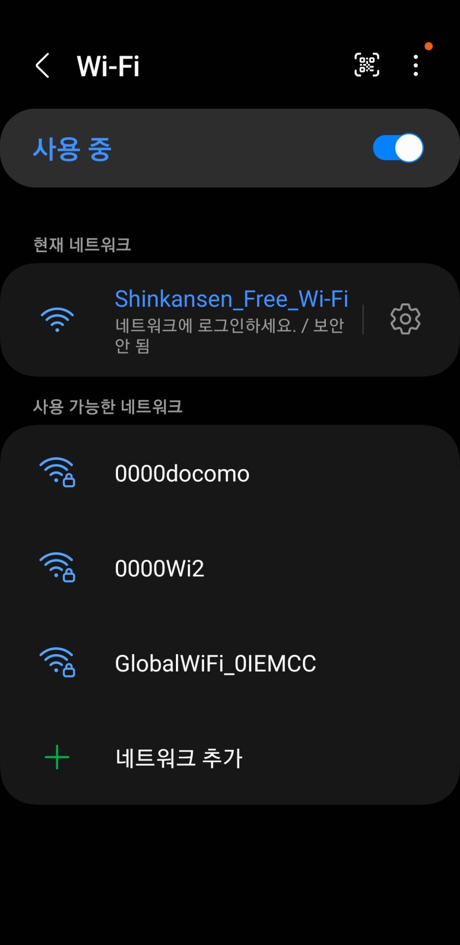 이번 기차여행은 3시간이 넘어서 인터넷이 반드시 필요했었다. 신칸센 히카리에는 무료 와이파이를 제공하여 연결을 해보았다. 먼저, 스마트폰의 와이파이로 들어가서 신칸센 프리 와이파이를 선택한다.