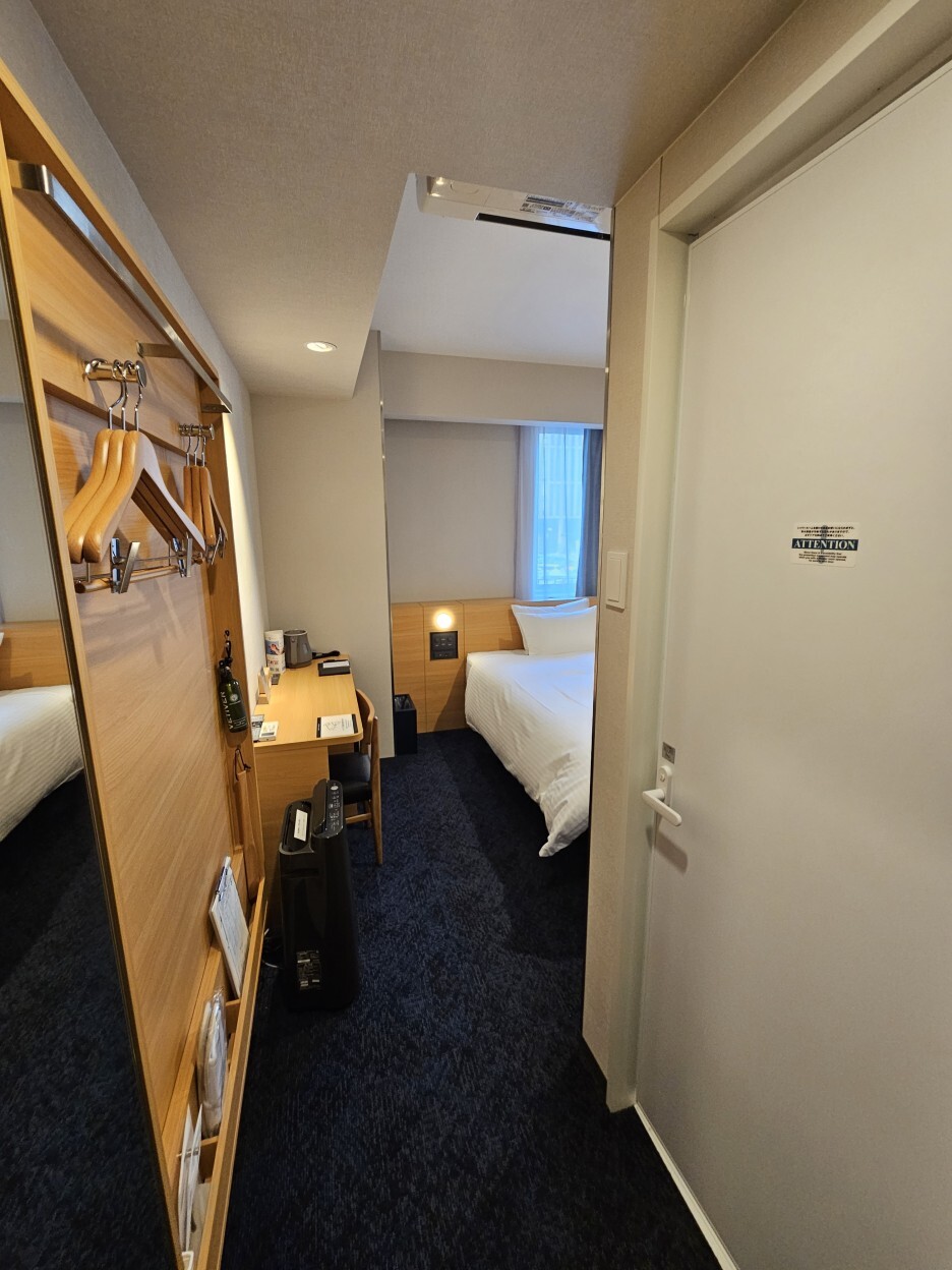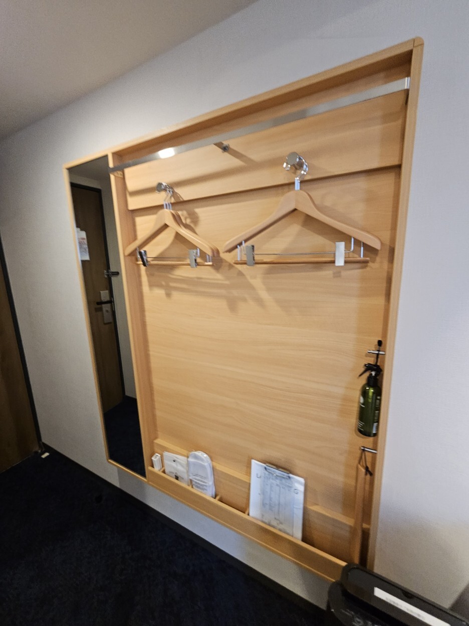옷장이 있으면 더 좋겠지만, 이렇게 옷을 걸 수 있는 옷걸이들이 잘 정돈 되어 있다. 그리고 일본 호텔의 필수품 섬유탈취제도 구비되어 있다.