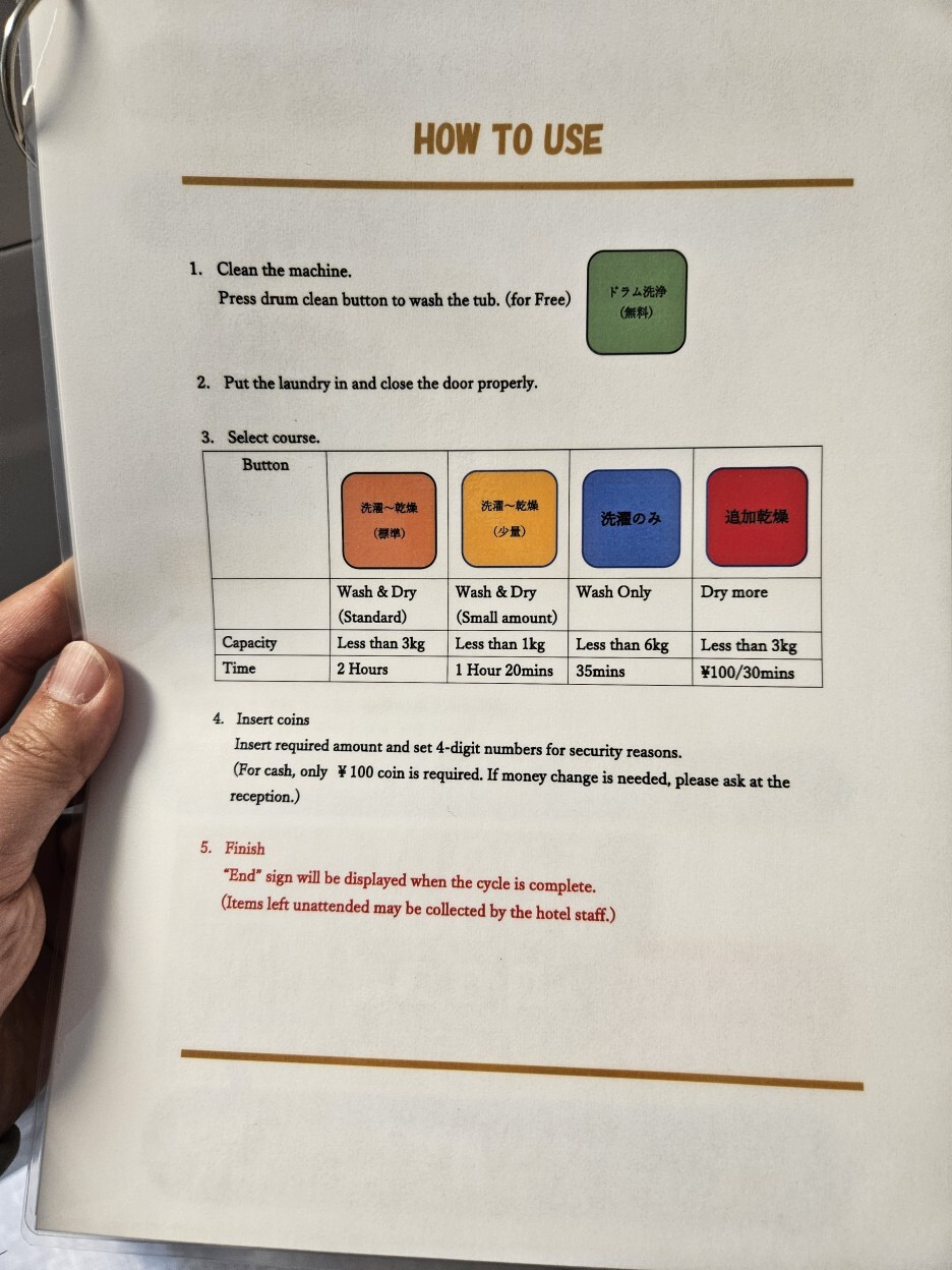 신규 호텔이라 그런지, 여기서는 교통계 전자 카드로 코인세탁기 비용을 지불할 수 있었다. 여기서 주의해야 할 점은 먼저 금액을 선택한 후, 전자카드 IC 카드를 터치해야 한다는 것. 카드가 터치된 이후에는 취소나 환불이 안되니 정확하게 본인이 사용할 금액을 먼저 잘 고르고 선택한 후, 카드 터치를 해야 한다. 나는 하마터면 카드에 남은 금액을 쓸데없이 세탁기에 다 기부할 뻔했다.
