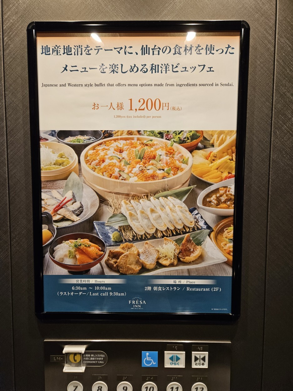 숙박객은 1인 1,200엔으로 조식을 먹을 수 있다. 다양한 센다이의 특산물을 먹을 수 있다고 한다. 특히, 센다이 명물인 규탕 우설 카레도 있다.
