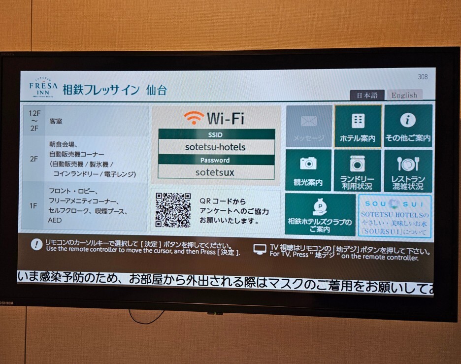 TV에서는 와이파이 정보와 시설 정보 등을 볼 수 있다. 한국어는 지원하지 않아서 아쉽다. 간단한 호텔 안내와 주변 관광 정보를 볼 수 있고, 코인 세탁기 사용 현황, 레스토랑 혼잡 상황 등을 볼 수 있다.